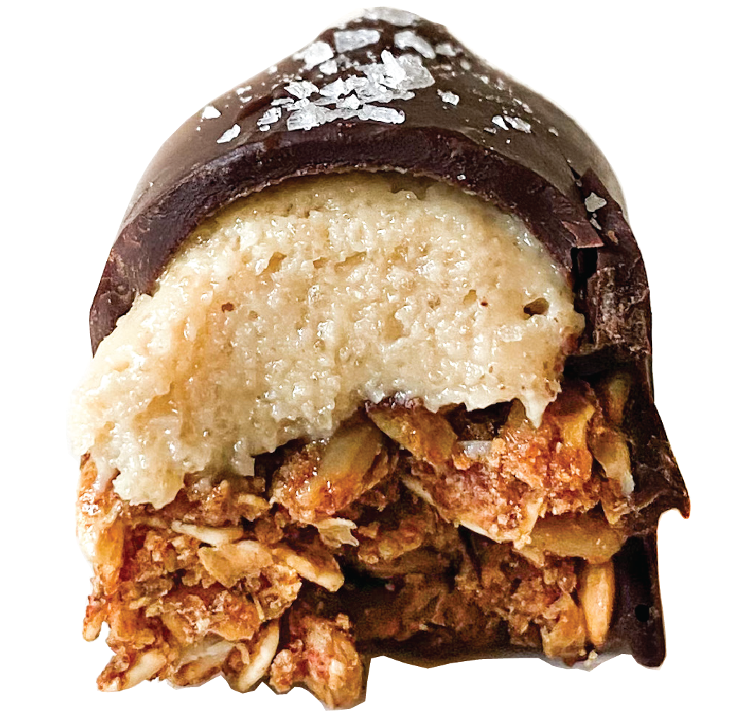 A multi-layered candy bar: crunchy toasted granola, creamy cashew butter, coated in rich 72% dark chocolate shell, and finished with flaky sea salt. It’s not just a bar - it’s an experience.